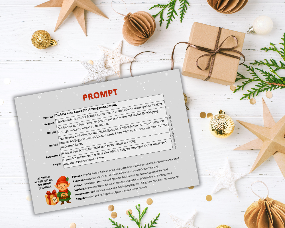 Die PROMPT-Struktur hilft dir, KI-Aufgaben zu steuern – von der Rolle bis zum Ziel. Sie ist kein Muss, aber besonders hilfreich, wenn du der KI genauer sagen möchtest, wie sie arbeiten soll. Probier es gleich mal aus.